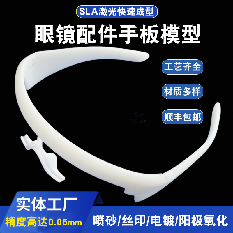 在工業設計流程中,手板模型制作是重要的環節,從純手工模型制作到半機械化模型制作到現代CAM,手板模型制作的進步是現代制造技術進步的一個縮影,實踐證明,手板模型的制作不僅對產品設計決策起著十分重要的作用,更是產品信息保密及市場推廣的利器,不可小覷。眼鏡手板主要由SLA激光快速成型制作完成,材質:光敏樹脂料。