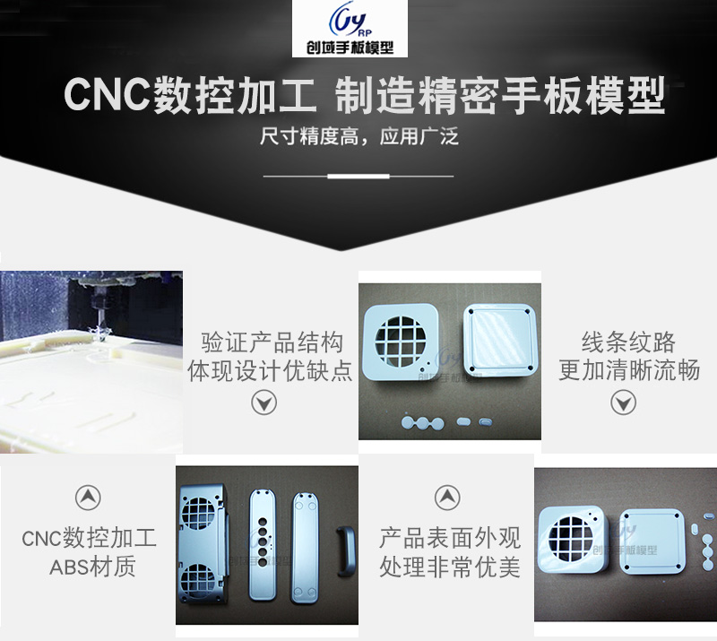 創域手板模型擁有高精密CNC電腦鑼,采用ABS膠板﹑鋁合金﹑壓克力POM等材料,能為貴公司制造出結構精密﹑高強度﹑高韌性的手板模型。本公司可以制做家用電器類、玩具類、醫療器械類、消費類電子、通信類、數碼產品類、工具類手板模型等。